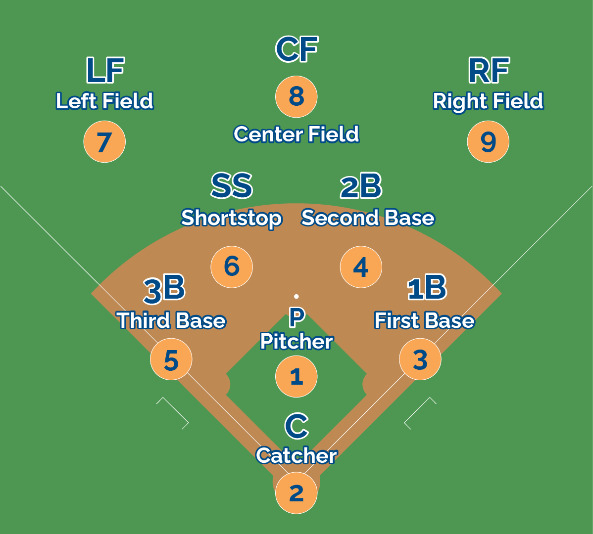 There are 9 positions on a softball field. The positions are listed below - each team will have 3 floating players to use for any position.